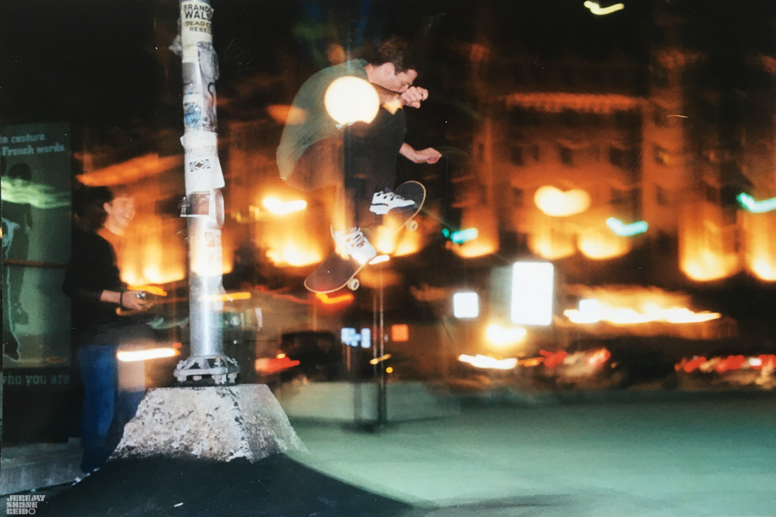 There was construction happening in the downtown core back then and this spot we were skating was a product of that construction. I am pretty sure there was a structural reason for this spot we were skating but we didn’t care about that. They (the city?) basically grounded and secured some sign and light posts with asphalt accidentally making a nice little ramp up to the angle bank of the light post making an excellent bump/jump ramp to wallie thing. So much fun to cruise right up and launch off of these things. They were there for a short time that summer and we made the best of them.