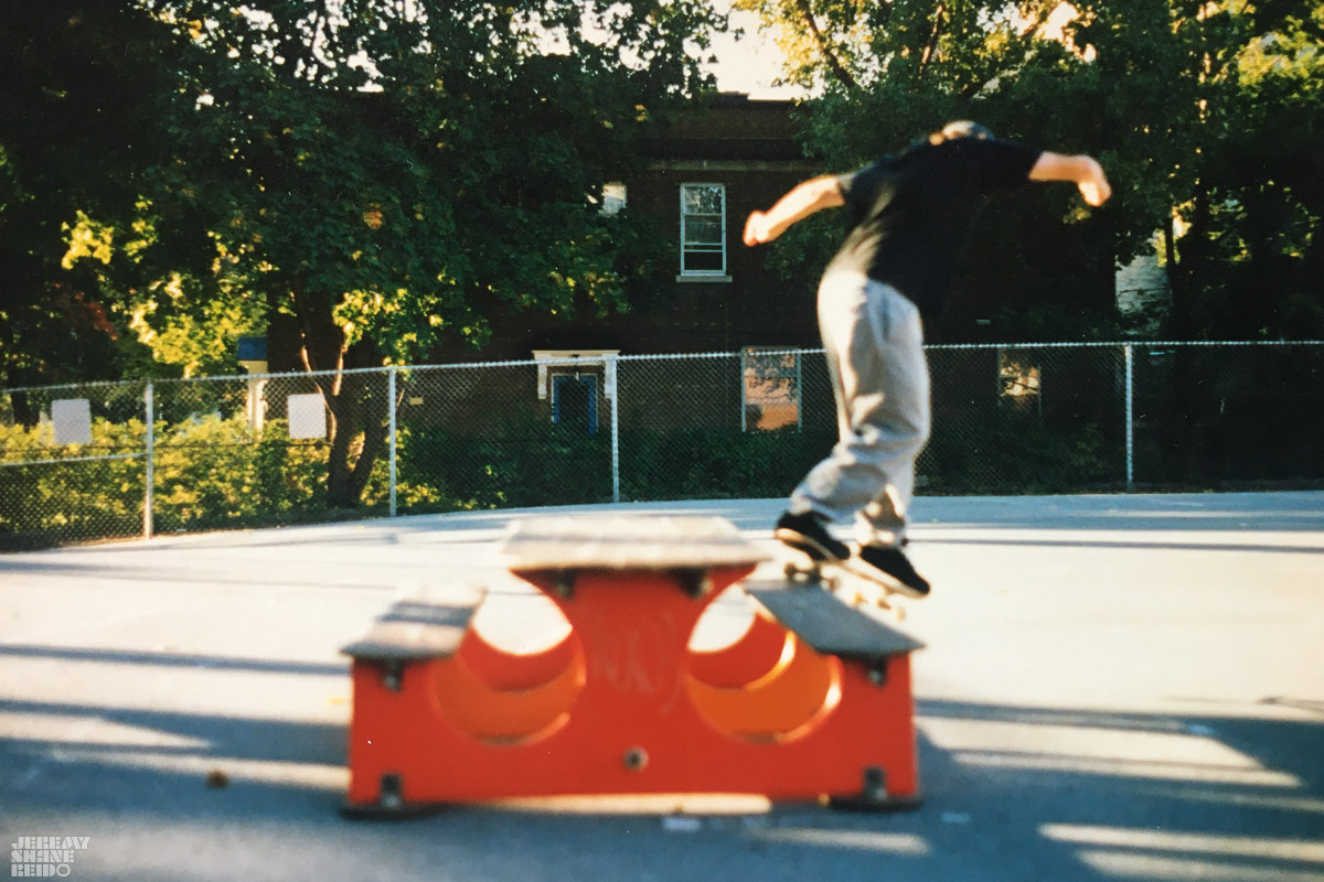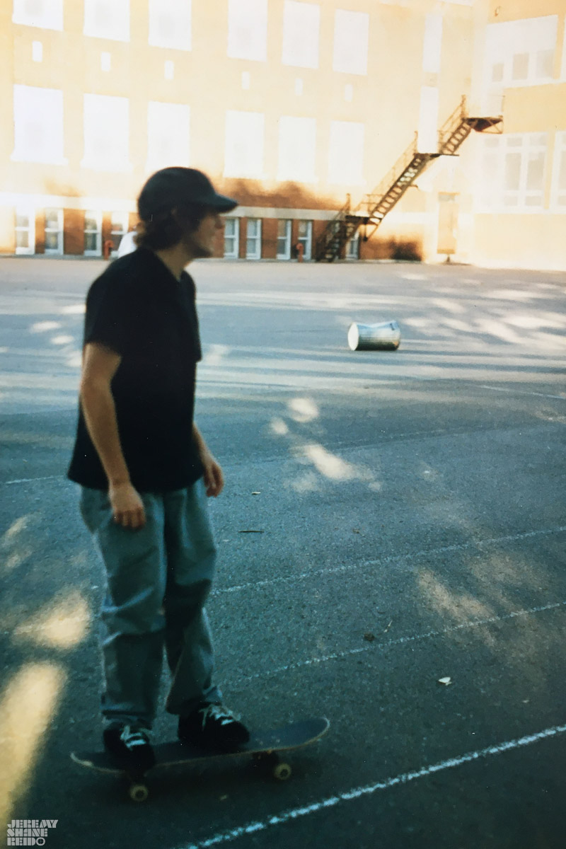 This spot was a schoolyard a few blocks from Rob’s place. From what I remember it was a fun spot, smooth pavement with a nice skateable picnic table! It was perfect. Here are a couple of “soft focus” shots of Rob. I always struggled with the manual focus cameras back then as my eyesight is less than perfect. Combine that with being new to taking photos and photos of things moving!