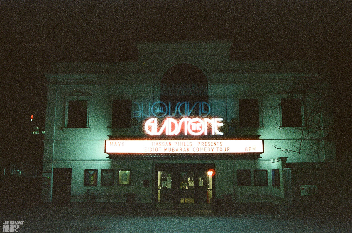 Ok so I went out a few different times with the Cinestill to see how the film handles different lighting situations. It is a fast film and I know people use it for nighttime photography so I figured I would give that a shot first. These first shots were taken one night as I was biking home from work. I wasn’t fully prepared for and did not bring a tripod so I shot all of these wide open at f/2 handheld. While they may not all be the sharpest photos I think they turned out pretty cool. I like the way the light halos look and the ghost image on the Gladstone sign is a mysterious surprise.