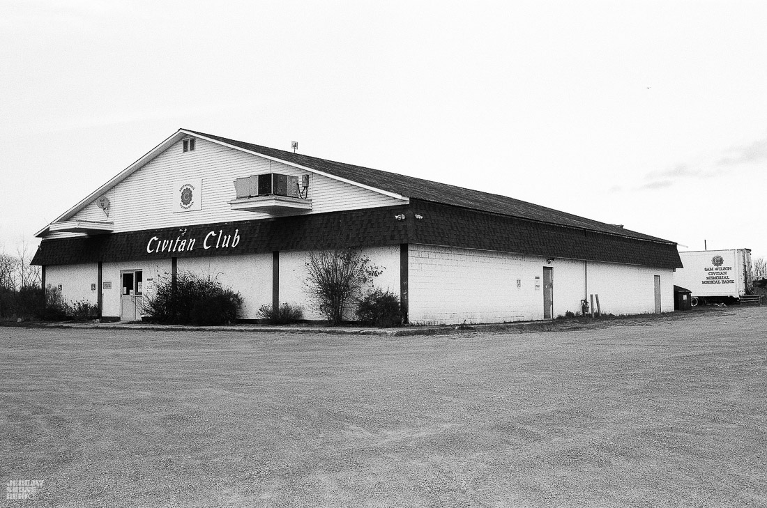 Anyways I had to load up another roll and luckily I had another roll of TMAX 400 in my bag so in it went so I could get a few more shots in of this large building on the edge of town, beside some sort of industrial plant. I had noticed the sign before on previous trips down this highway. The name Civitan Club peaked my interest and the lettering of the sign was unique too. I am always a sucker for a good font or unique and original typography and find myself drawn to photograph anything that looks old, odd or original to me. I popped off a few frames of the building and the adjacent industrial plant and headed on home from my trip to Smiths Falls.