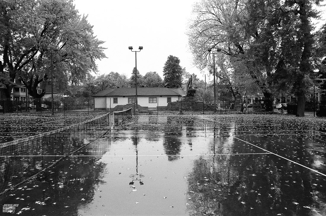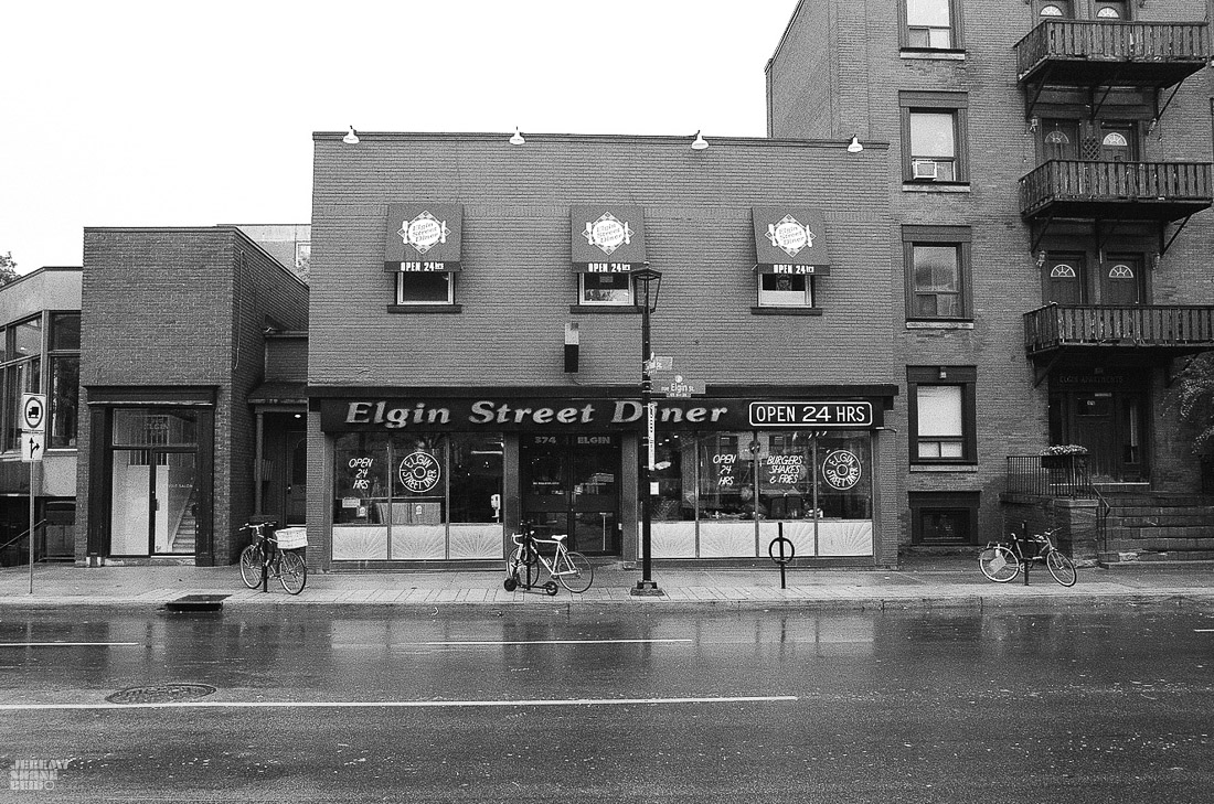 The next few frames are from me walking my dog Sasha around the Arboretum which is another daily event in my life. Continuing on with the visual documentation of my daily life, here are a few more pictures around the tennis court that I walk by on my way to work on a rainy day last summer. Then it is the Elgin Street Diner (which is right beside the Manx, the little pub that I work at). I walk by the diner so many times and have taken a bunch of photos of it, trying to get the “perfect” shot. I don’t think the perfect shot actually exists but I will keep on trying to get a good one with no cars out front and the right lighting. This time I caught it with no cars and the wet road reflections.
